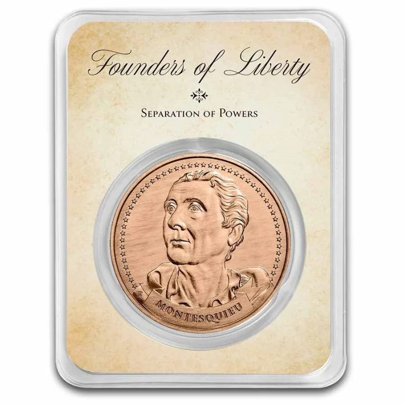 Awers miedzianego medalu prezentuje popiersie Monteskiusza, na którym dumnie spogląda w górę. Na dole, na wstędze widnieje imię postaci. Rewers przedstawia w symboliczny sposób ukazany jego system podziału Państwa, gdzie władza ustawodawcza, wykonawczą i sądowniczą są od siebie niezależne, jednak razem ze sobą współpracują. Na dole umieszczono wagę medalu wynoszącą 1 uncję AVPD, czyli 28,35 grama.