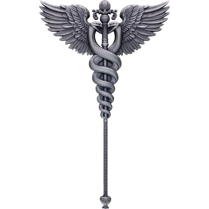 Kaduceusz przedstawiono jako srebrne, bogato zdobione berło, wokół którego symetrycznie owijają się dwa węże. Ich splecione ciała tworzą harmonijną całość, podkreślając ideę równowagi i zgody. Na szczycie laski znajdują się delikatne skrzydła, symbolizujące szybkość, lekkość i ruchliwość Hermesa, najszybszego z bogów Olimpu. Całość prezentuje się niezwykle elegancko, pełna jest detali i misternego wykonania, dzięki czemu stała się rozpoznawalnym i nieodłącznym atrybutem Hermesa, a także jednym z najbardziej charakterystycznych symboli antycznej mitologii. Walor dostarczany jest w eleganckim paradnym pudełku z dołączonym certyfikatem producenta.