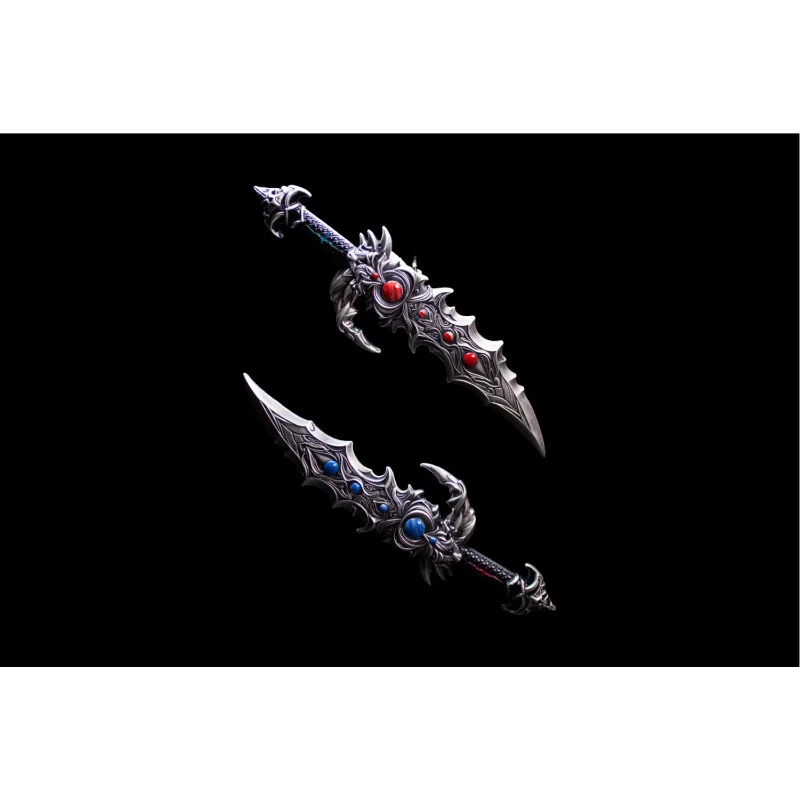 Prezentujemy wyjątkowy komplet składający się z dwóch ozdobnych sztyletów, nawiązujących do świata fantasy. W świecie fantasy broń od zawsze pełniła rolę nie tylko narzędzia walki, ale także symbolu potęgi, prestiżu i magii. Jednym z najbardziej intrygujących przykładów takiego przedmiotu są niezwykła magiczne miecze zdobionym ornamentami i wypełnionym tajemniczymi kryształami. To broń, która wygląda, jakby została wykuta nie tylko ze stali, ale i z samej esencji chaosu. . Ich ostre, faliste krawędzie, smoczy jelec, błękitne i czerwone kryształy czynią z nich dzieło sztuki, ale i przestrogę. To nie tylko narzędzie walki – to artefakt, który sam wybiera swojego właściciela.