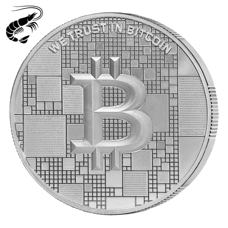 Rewers medalu zdobi symbol kryptowaluty Bitcoin w postaci literki "B" umieszczony na geometrycznej, kwadratowej mozaice. Na samej górze znajduje się napis WE TRUST IN BITCOIN. Na odwrocie umieszczono portret zakapturzonej postaci o cybernetycznej twarzy, symbolizującej świat kryptowalut. Po lewej stronie4 znajduje sie4 oznaczenie czystości srebrna, po prawej zaś waga waloru wyrażona w mikrogramach.