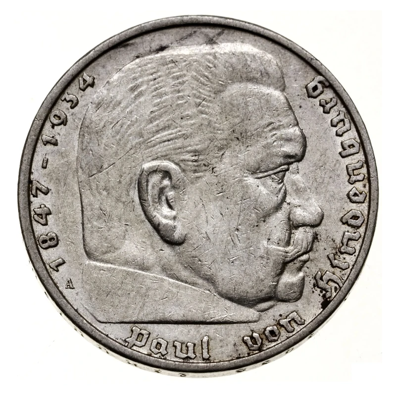 Moneta o nominale 5 marek niemieckich bita w latach 1934–1939 była częścią systemu monetarnego III Rzeszy. Wykonana była ze srebra (90%), miała średnicę 29 mm i ważyła 13,88 g. występowała w dwóch głównych wersjach z wizerunkiem Paula von Hindenburga. Pierwsza z nich, wprowadzona w 1935 roku, przedstawiała popiersie Hindenburga na rewersie oraz orła ze swastyką na awersie. Druga wersja, wydana w 1934 roku z okazji "Dnia Niemieckiego" (Tag der Deutschen Kunst), miała na rewersie Kościół Garnizonowy w Poczdamie, gdzie w 1933 roku odbyła się symboliczna ceremonia przekazania władzy Hitlerowi.