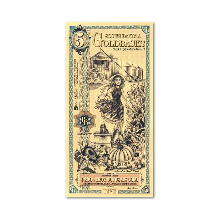 Prezentowany Goldback należy do pierwszej edycji wydanej przez stan Południowej Dakoty. Tym razem na banknocie przedstawiono cnotę odpowiedzialną za rozwój przemysłu, Industrię. Podkreśla to wagę rozwoju gospodarczego dla tego regionu. W dolnej części widzimy fragment pola uprawnego wraz z plonami, za postacią młodej dziewczyny wyłaniają się silosy na zborze, pod nimi mamy ułożone bele ściętej słomy. Na samym dole podany jest nominał i waga złota z jakiego wykonano banknot.